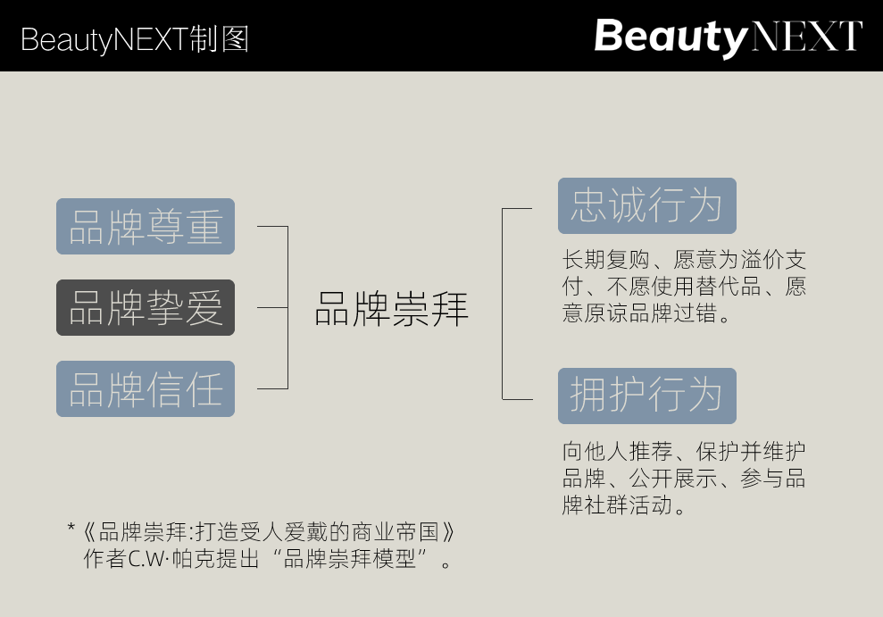 品牌学者C.W·帕克进一步发展了品牌的情感层级理论模型,在其著作《品牌崇拜:打造受人爱戴的商业帝国》中提出了著名的“信任-挚爱-尊重-信仰”的“品牌崇拜模型”。