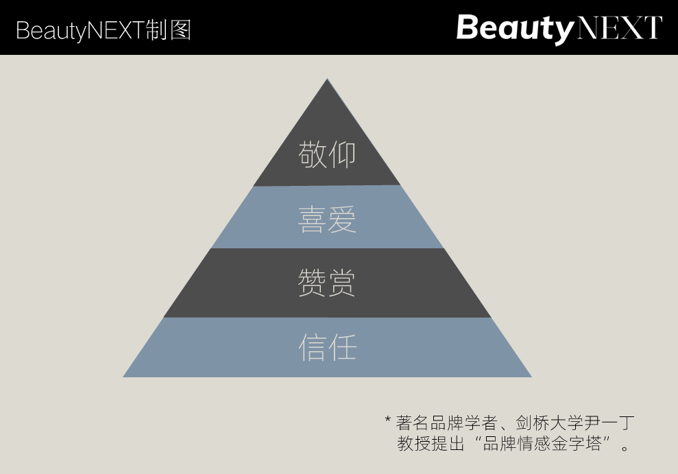 著名品牌学者、剑桥大学尹一丁教授的研究指出,用户情感一般可以分为4个层次:信任一赞赏一喜爱一敬仰。这四种情感强度逐级升高,形成一个“品牌情感金字塔”。