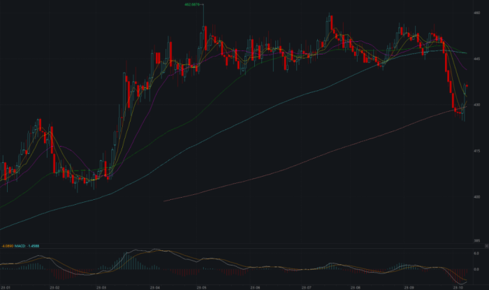10月6日,伦敦金一度继续下探,但最终以约430元每克收盘,当日上涨0.70%,结束了连续下跌势头。10月9日开盘,受国际形势影响,投资者避险需求增加,当日伦敦金约上涨0.69%,以436.29元每克收盘,但仍未达到9月25日的相对高位。