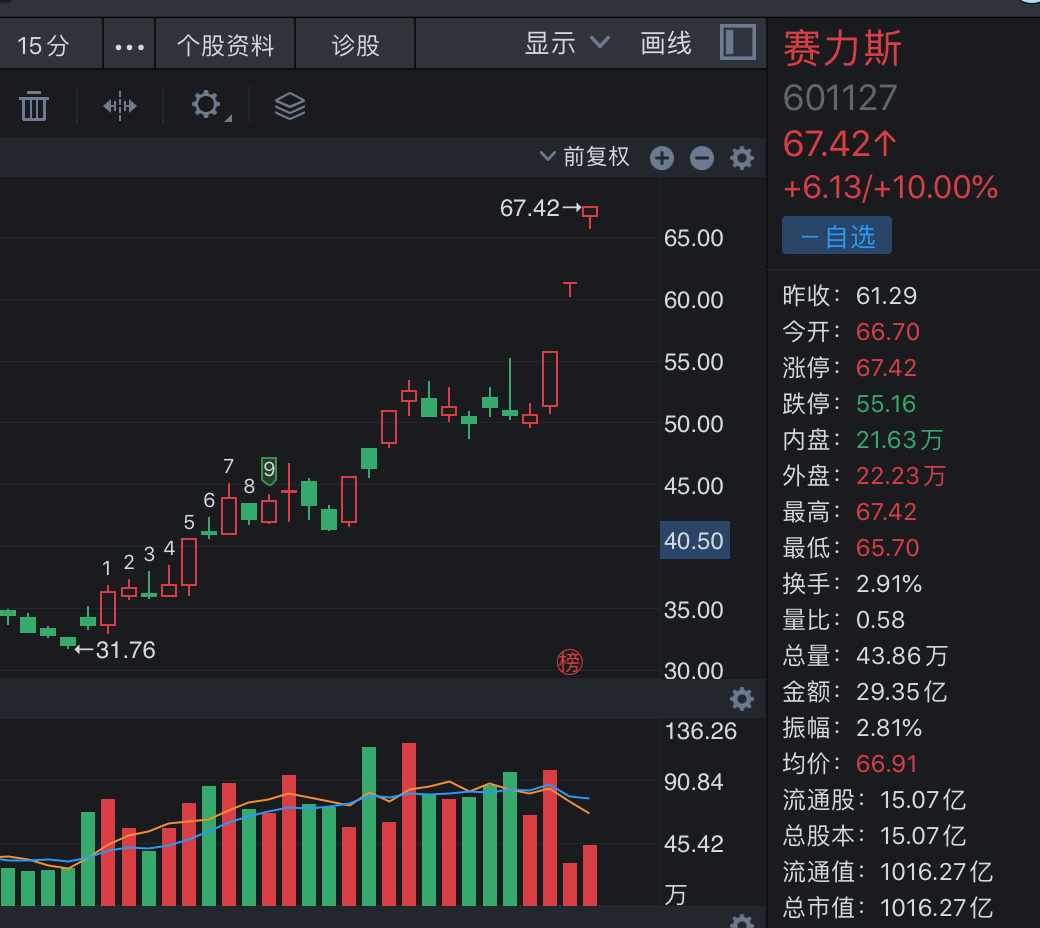 作为“华为汽车”概念股的代表,赛力斯(601127.SH)已连续完成了3个涨停板。从这轮上涨之初的8月28日算起,截至10月10日,赛力斯累计涨幅已超过110%。