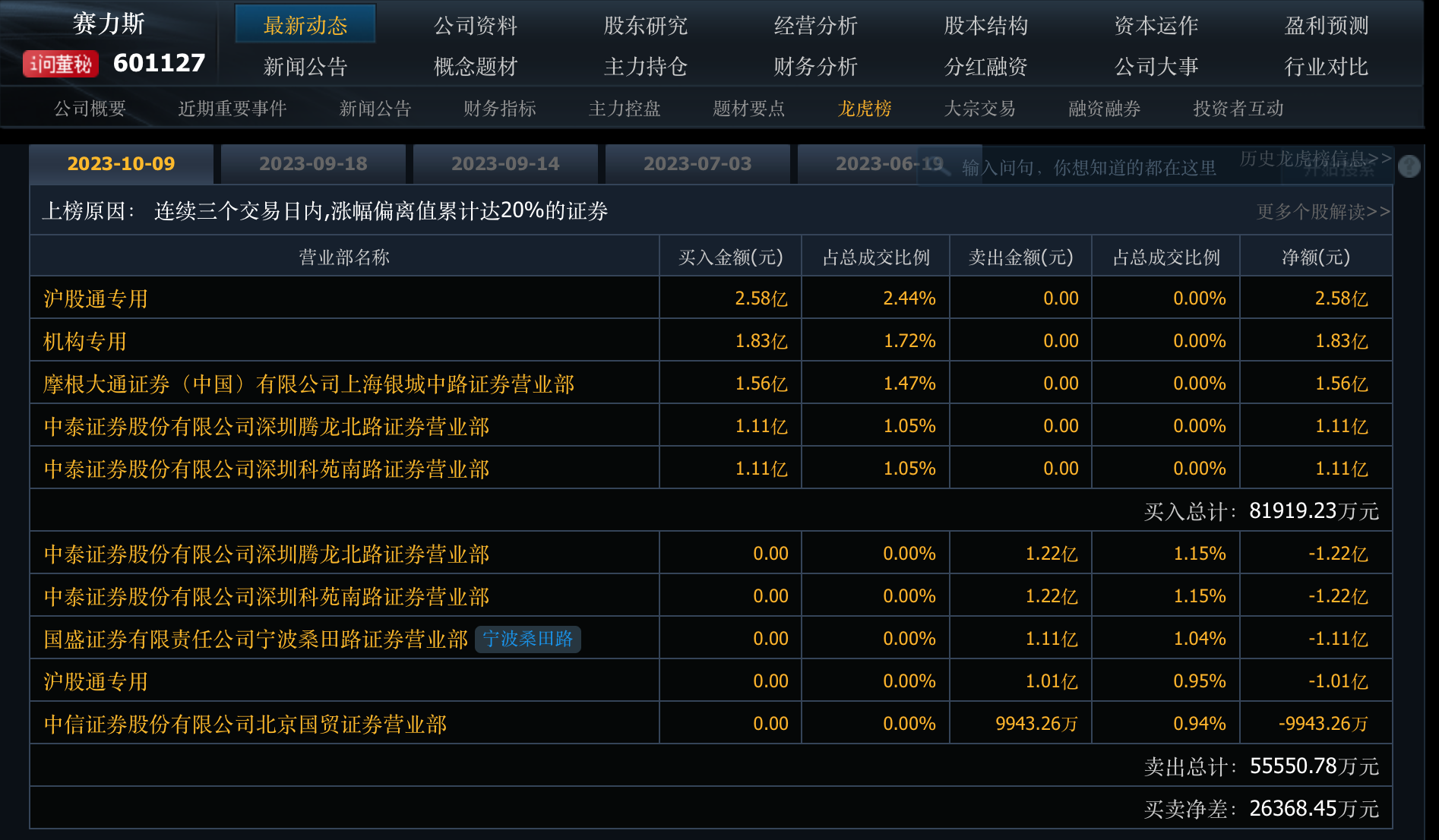 10月9日披露的连续三个交易日龙虎榜显示,赛力斯的大涨,是机构和游资的合力所为。买1席位是“沪股通专用”席位,买入金额2.58亿元;买2席位是“机构专用”席位,买入金额1.83亿元;其他跻身前五的买家还有摩根大通上海银城中路营业部、中泰证券深圳腾龙北路营业部、中泰证券深圳科苑南路营业部。