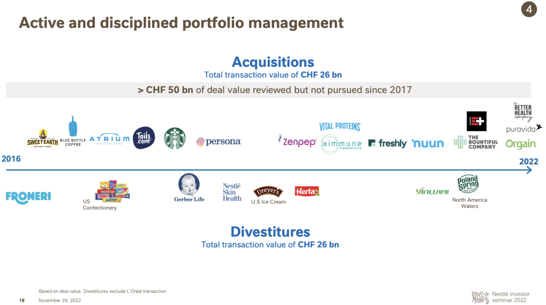 Roger在会上表示,几年前,雀巢需要解决业务组合的问题来实现4%~6%的中个位数有机增长目标,并为此做了许多工作,包括大量的剥离和收购。如今,雀巢已对业务组合“充满信心”,且不需要通过并购来确保上述增长水平。