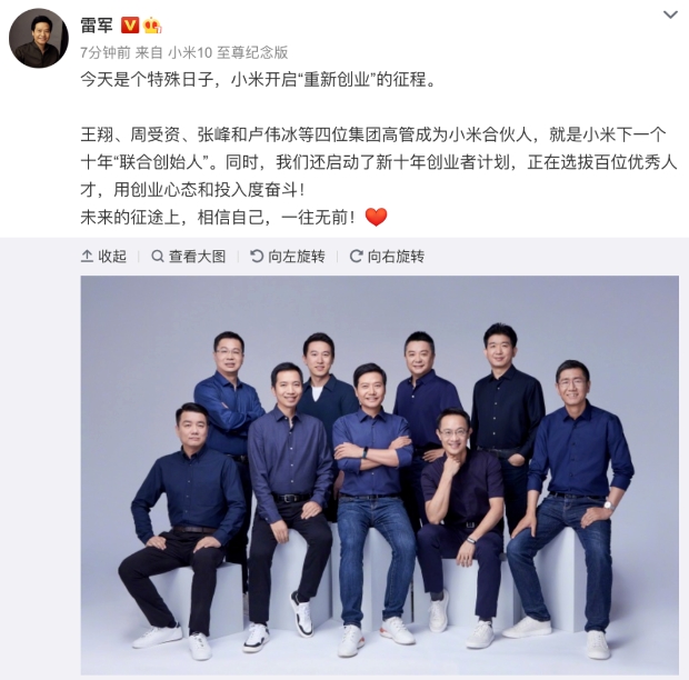 除了前述提到的这些,雷军口中还提到的一件大事便是小米下一个十年要重新创业,为此小米将实行合伙人制度和新十年创业者计划。伴随着这件大事的公布,小米合伙人团队迎来了四位新成员,此次传出出走消息的张峰便是其中之一。