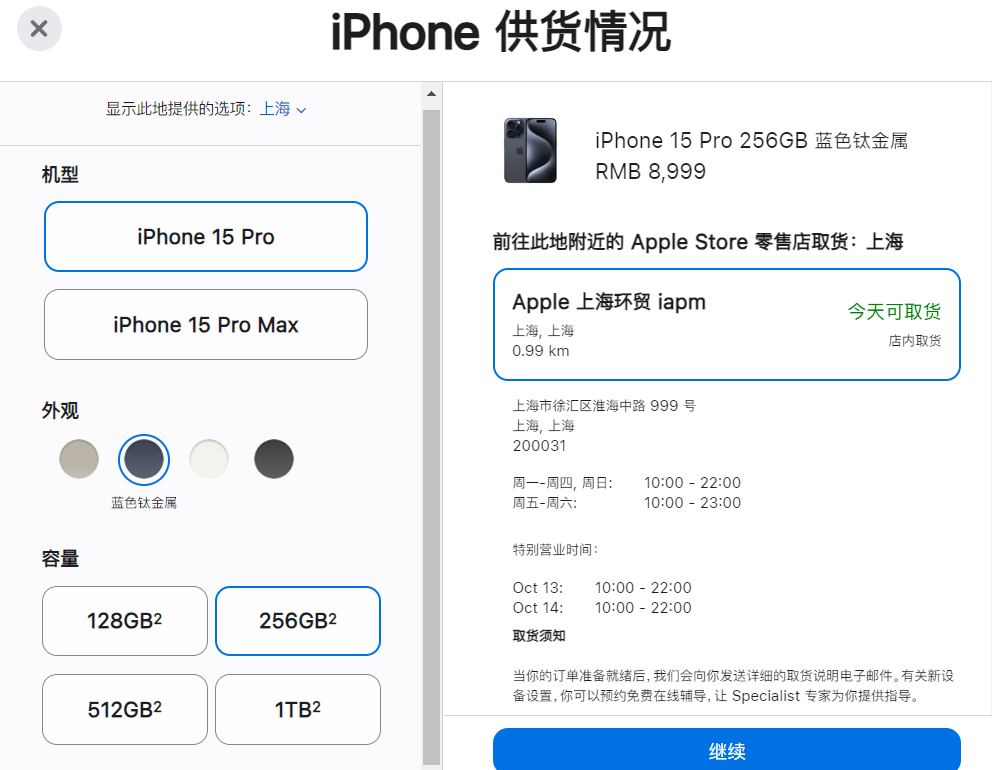 10月8日,第三方渠道又传出iPhone 15 Pro系列蓝色版比官网便宜1500元的消息。从10月9日上海各大苹果直营店的供货情况来看,蓝色版的确是最不受欢迎的,iPhone 15 Pro和Pro Max的蓝色版均有现货。
