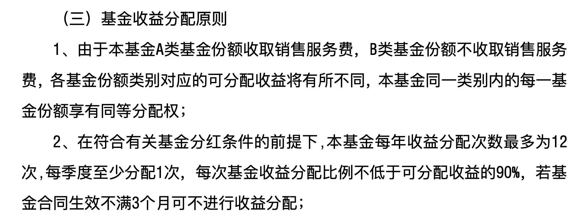 第四,按合同规定,有些产品是必须分红的。比如,公募REITs,基金合同里规定了强制分红的。还有某些固收类产品,按照合同相关规定,在达到一定规模或其他条件下,也是必须分红的。以三季度实施分红的最大规模债基——天弘永利债券为例,该基金合同显示,基金在符合有关基金分红条件下,每季度至少分红一次。