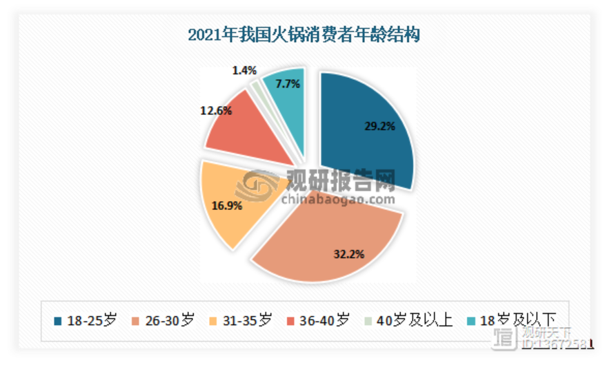 从年龄结构看,18-30岁的消费者是火锅消费的主力人群,占比超六成。其中26岁-30岁消费者占比最大,为32.2%;其次为18岁-25岁,占比为29.2%。而40岁以上的人群受到长期以来的饮食习惯的影响,对火锅的消费热情较少,占比仅为1.4%。