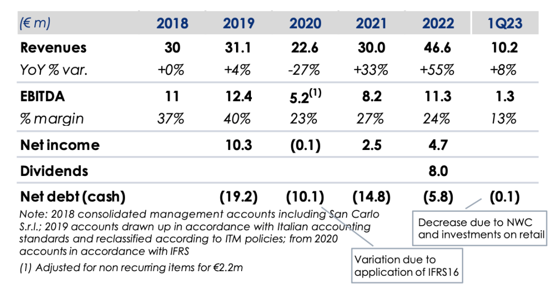 从Santa Maria Novell财报来看,在2021-2023Q1,Santa Maria Novell收入分别为3000万欧元(约合人民币2.36亿元)、4660万欧元(约合人民币3.66亿元)、1020万欧元(约合人民币8008.17万元),增幅分别为33%、55%、8%;EBITDA(注:税息折旧及摊销前利润)分别为820万欧元(约合人民币6438.44万元)、1130万欧元(约合人民币8872.49万元)、130万欧元(约合人民币1020.65万元)。