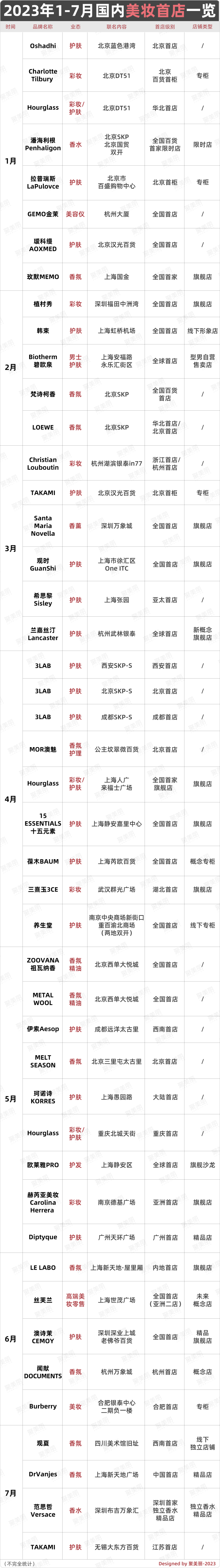 从统计结果来看,高端外资护肤/香氛品牌开设的新店更多。在1-7月,潘海利根(注:在北京双开两家限时店)、玫默MEMO、梵诗柯香、LOEWE、MOR澳魅、LE LABO、DrVanjes、Santa Maria Novella八个外资香氛品牌相继开设首店,同时范思哲Versace也在7月开设了深圳首家独立香水精品店;高端外资护肤品牌Oshadhi、Hourglass、碧欧泉Biotherm、希思黎Sisley、葆木BAUM、兰嘉丝汀Lancaster等也相继在国内开设全国首店。
