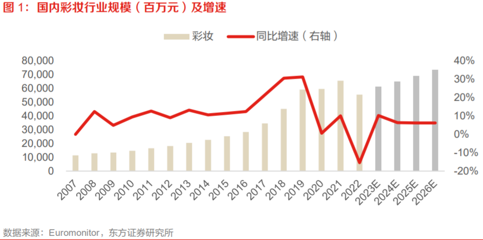 近年国内彩妆市场已经趋于饱和化,国货彩妆规模甚至出现了下滑。据Euromonitor、东方证券研究所数据显示,在2022年,我国彩妆行业规模为555.3 亿元,同比下滑15.4%。