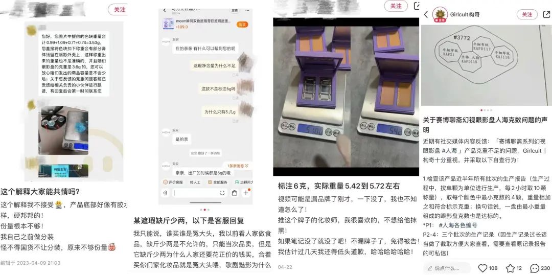 其中,部分国货彩妆引发“缺斤少两”的争议,比如在今年4月有分装博主对Girlcult构奇赛博聊斋幻世眼影盘和MCOM眸珂双色遮瑕膏两款产品提出了实际克重少于标注净含量的质疑。