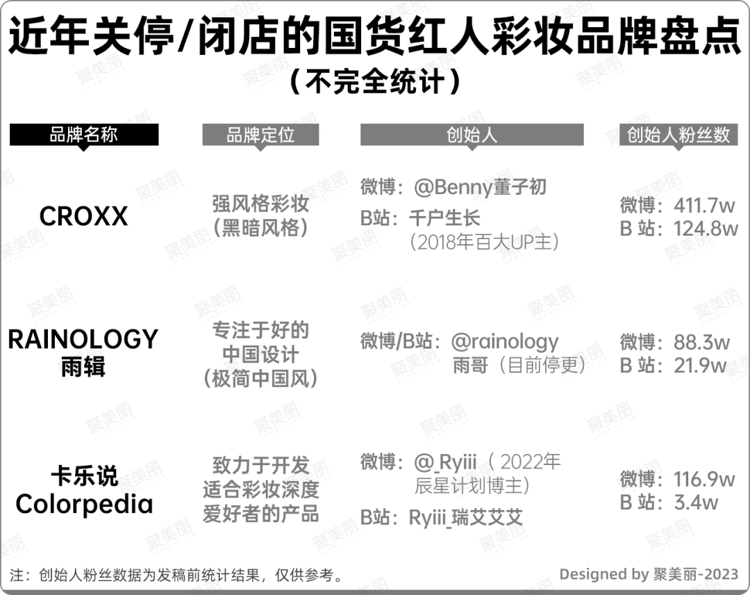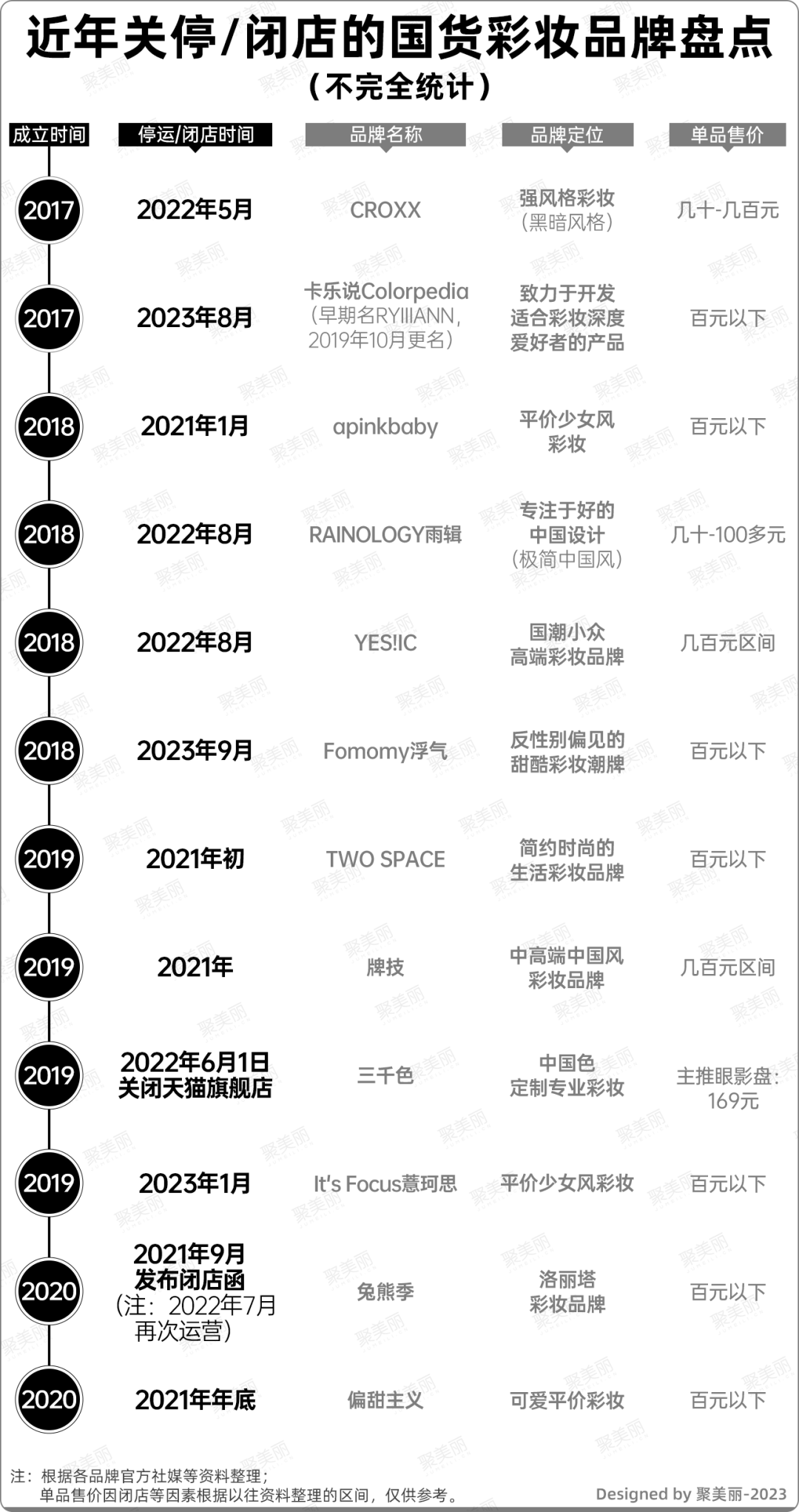 据聚美丽不完全统计,2018年至今,已有12个品牌宣布闭店/停止运营,其中兔熊季在2022年7月再次运营,并在同年8月推出与Mikko的联名产品,其余基本停止生产。