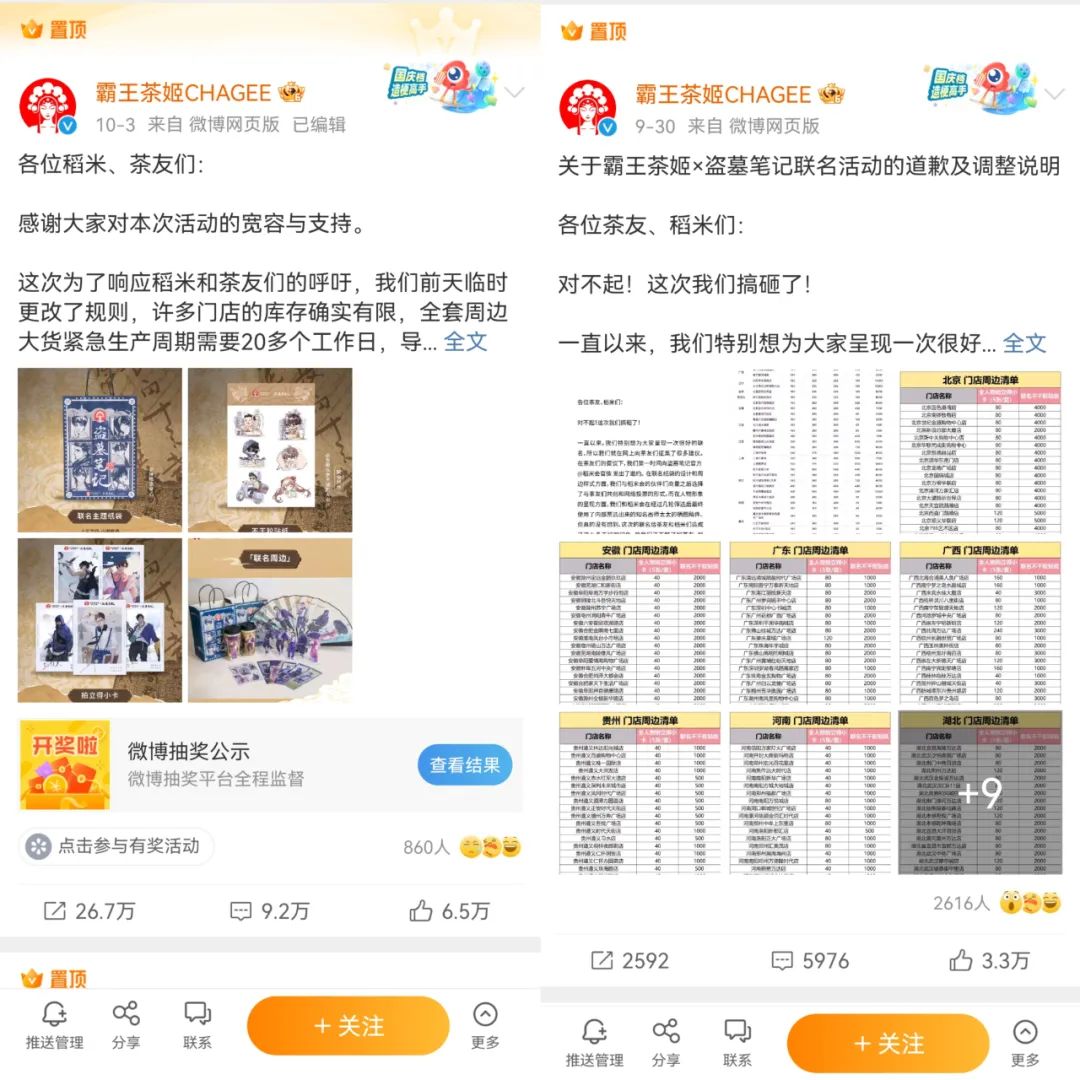 如今,联名款上线首周已过。霸王茶姬的官微依然置顶着两条面对广大稻米(盗墓笔记IP粉的昵称)的内容。一条是“感谢大家对本次活动的宽容与支持”的抽奖博,一条为“对不起!这次我们搞砸了!”的道歉声明,言辞不可谓不肯切。