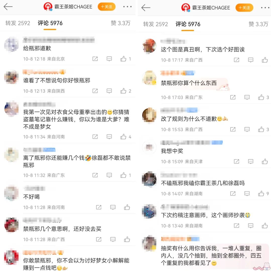 一直以来,以瓶邪(盗墓笔记中闷油瓶和吴邪的CP粉昵称)粉丝为核心的腐女群体始终是盗墓笔记IP的重点用户群,微博内瓶邪超话粉丝高达76.6万,数量超过盗墓笔记超话粉丝1/3,而在原著作者南派三叔的官方内容中,也多次发布相关内容,承认CP粉的作用。但在本次联动中,点名核心受众群并表示禁止,无疑是和粉丝群的“开战”,有网友戏称,这无异于“米哈游不要二次元玩家,迪士尼不要米老鼠唐老鸭,漫威不要钢铁侠”。如此奇怪规则,也迅速引发核心粉群的抵制,尽管霸王茶姬很快调整规则删除此条,但是损失的用户口碑却自此一去不返了。