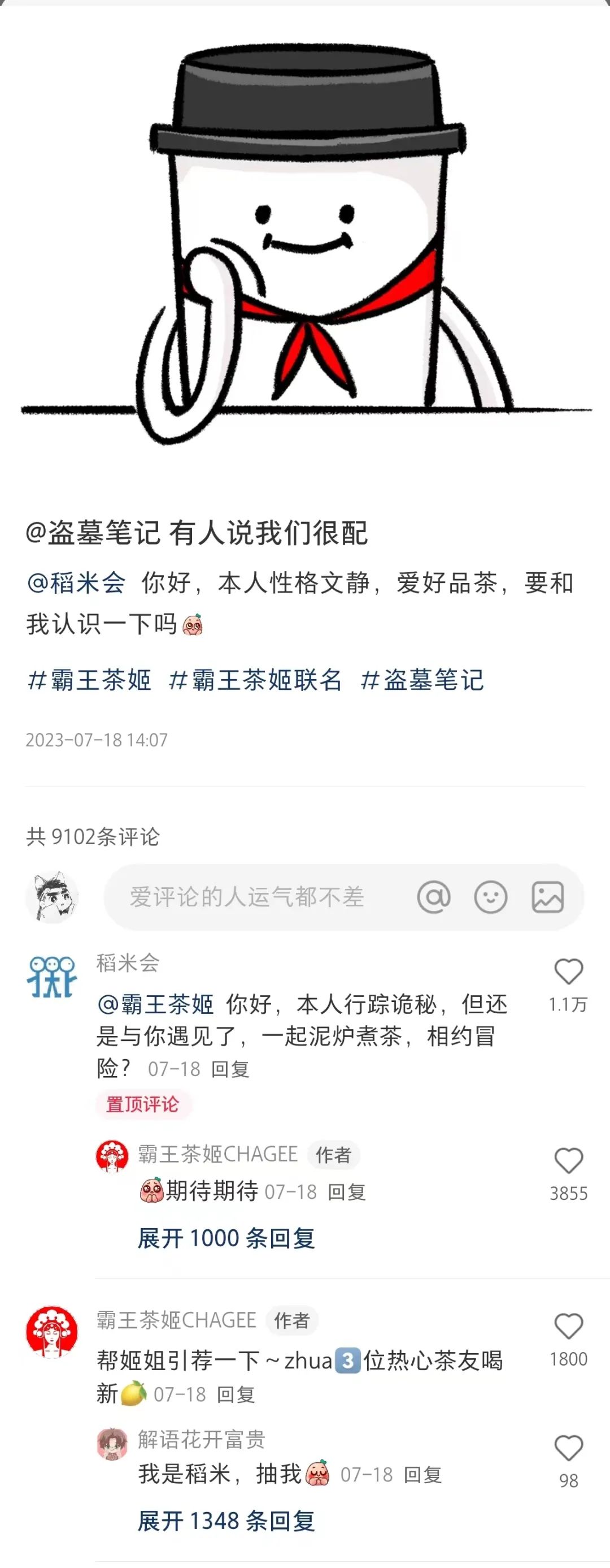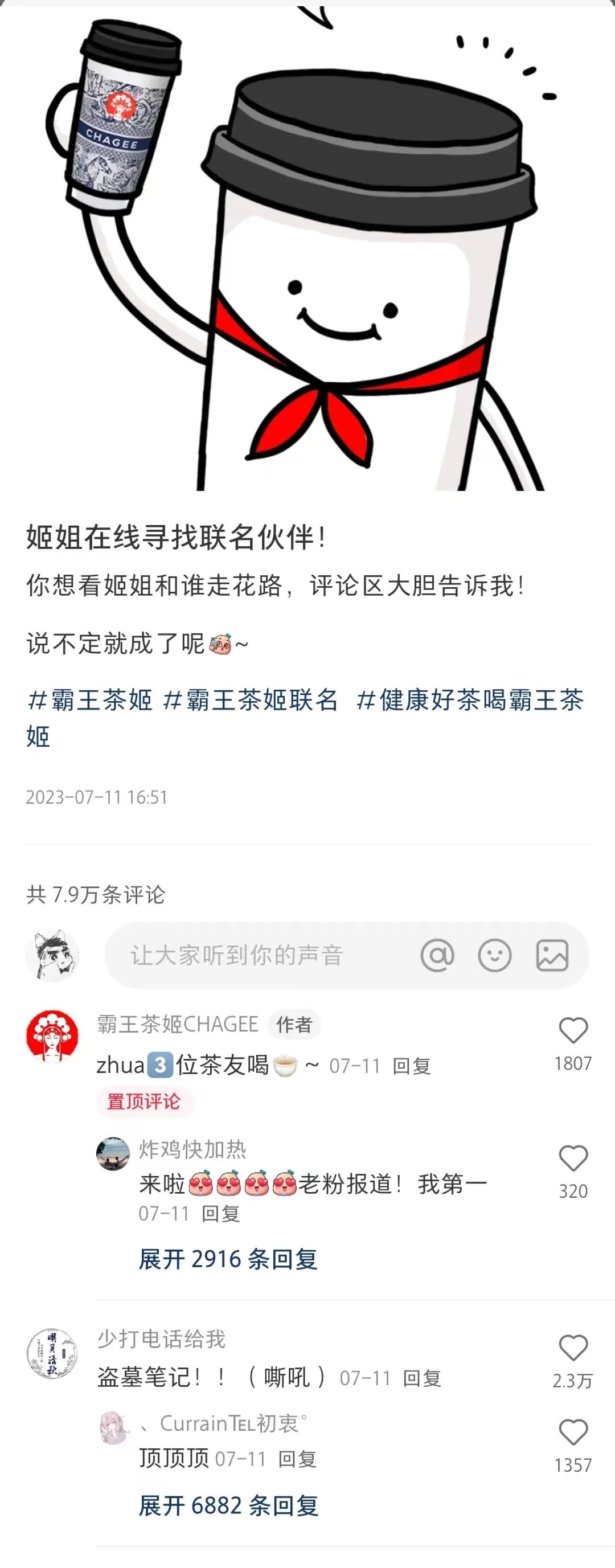 缺口造就了粉丝的热情,随着各个茶饮品牌展开联名内卷,不乏稻米在各品牌的联名征集区下留言求合作,霸王茶姬小红书官号7月的一条征集博下,盗墓笔记的提议便以2.3万点赞位列第一。