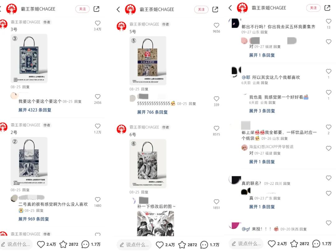小规模线下试水的同时,霸王茶姬也公布了联名的主菜:据品牌官方所言,本次合作的包装袋外观将采用网络征集的形式,在盗墓笔记的粉丝创作图中评选而出,根据大家投票决定。最终参与的画手也将获得品牌方给出的奖金和署名权。这样的征集合作,在此前各类二次元IP合作中前所未有,一时间,不少稻米画师报名参与,不同风格的包装设计图不一而足,也让大规模的线上联名实现了“未出先火”,将粉丝期待值拉满。