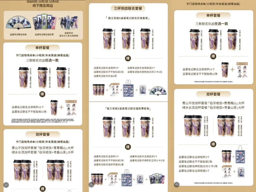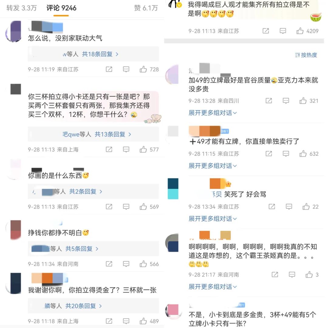 同时,不合理的买赠机制也加剧了粉丝的不满情绪。根据官方发布规则,不同角色对应的拍立得小卡为单张随机赠品,购入双杯奶茶仅可获得1张,无法指定角色。同时,折扇、镭射票等衍生品需要到达对应主题线下店购买不同的三杯套餐方能获得,如果想要角色立牌,还需要在上述基础,另加49元。