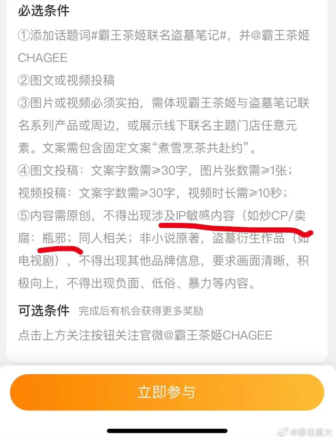 更为火上浇油的在于,霸王茶姬在本次联名的晒单话题活动中,设置了一条规则:“不得出现涉及IP敏感内容(如炒CP/卖腐:瓶邪)”,正中大批核心粉丝雷区。