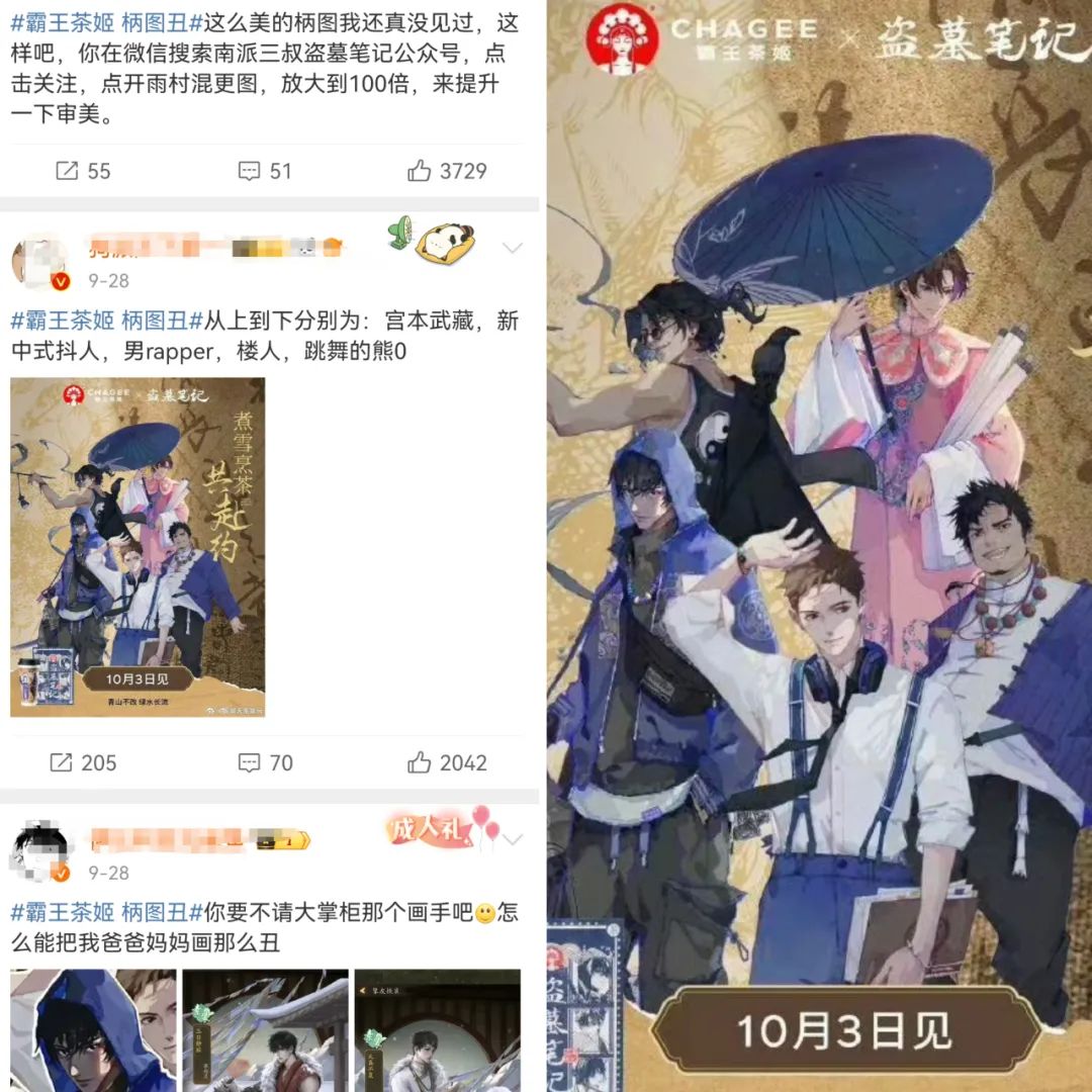 首先,伴随周边公开,“霸王茶姬 柄图丑”词条迅速登上热搜,所谓柄图,指的是此次联名合作的杯身、买赠周边的视觉组图,与此前公开征集的外包装图为不同的两套,由品牌方与IP方联手内部敲定。