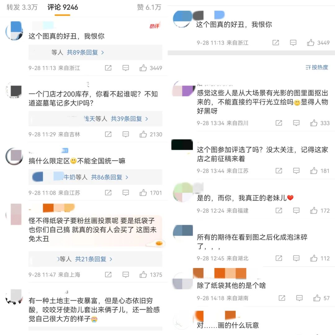 但如此大规模的线下联动,并没有使用新图或者圈内较高好评的画手作品,而是采用口碑参差的老图,自然引发了核心粉群的不满。连带此前的公开征集活动都变成了品牌方“审美乏力”的佐证,不少粉丝纷纷表示:“不如全部交由二创画手”等言论。