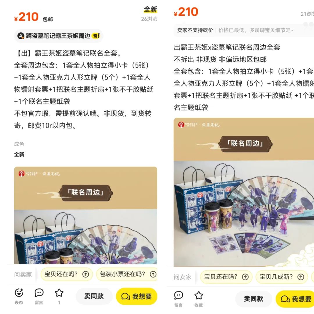 在意识到“失控”后,霸王茶姬迅速道歉并调整了买赠规则,但随之而来的是新问题:降低门槛后,用户下单火爆,“周边”库存不足。10月3日联名启动后,首日全国各地多个店铺的买赠周边便大规模售罄,二手交易市场开始出现高价倒卖现象。