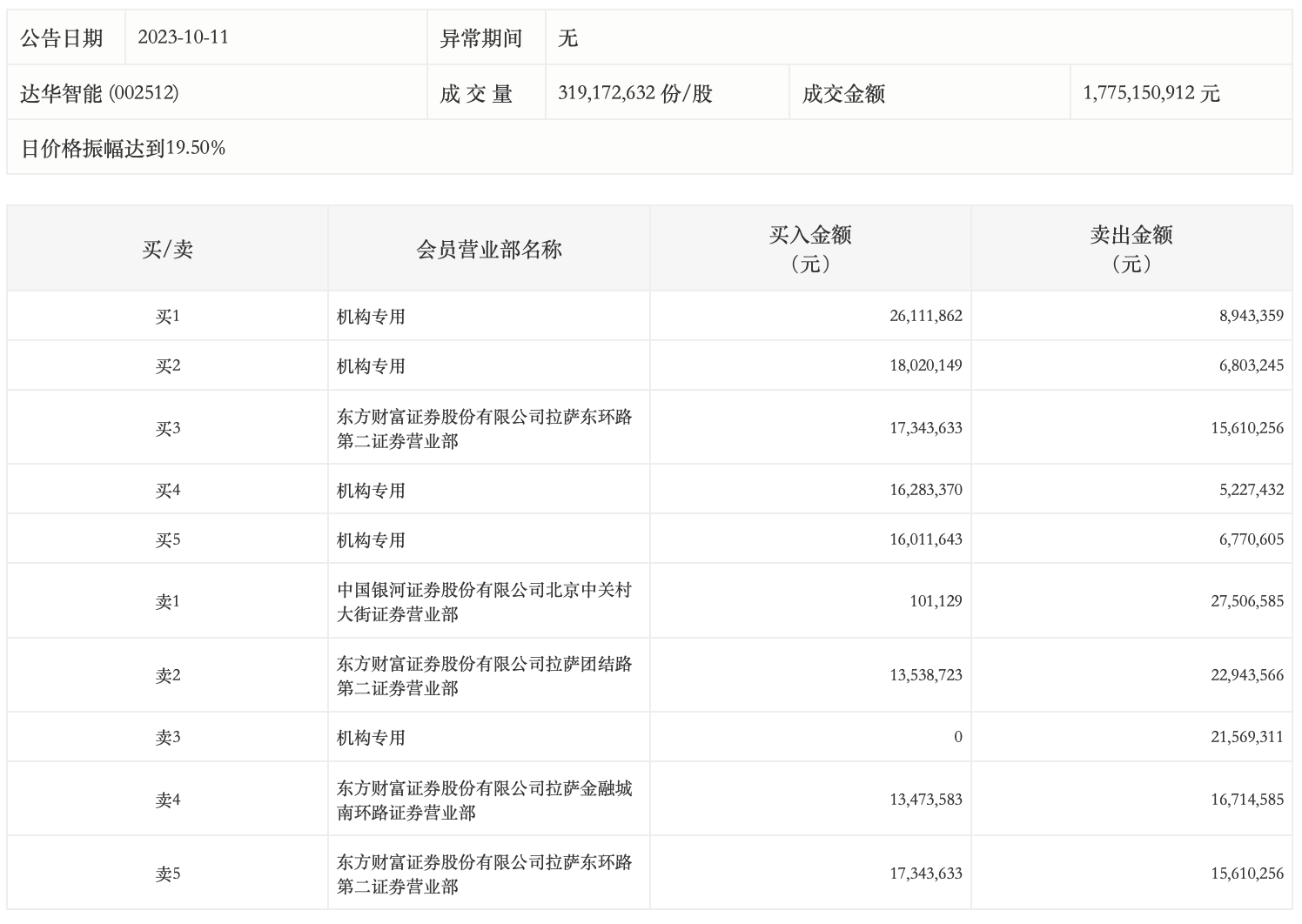 10月11日,达华智能今日跌7.38%,全天换手率达30.44%,振幅达17.93%。龙虎榜数据显示,营业部席位合计净卖出1120.49万元。其中,机构买入7642.7万元,卖出4931.4万元,合计净买入2711.31万元。此外,中国银河证券北京中关村大街证券营业部、东方财富证券拉萨团结路第二证券营业部分别卖出2750.66万元、2294.36万元;东方财富证券拉萨东环路第二证券营业部、东方财富证券拉萨团结路第二证券营业部分别买入1734.36万元、1353.87万元。