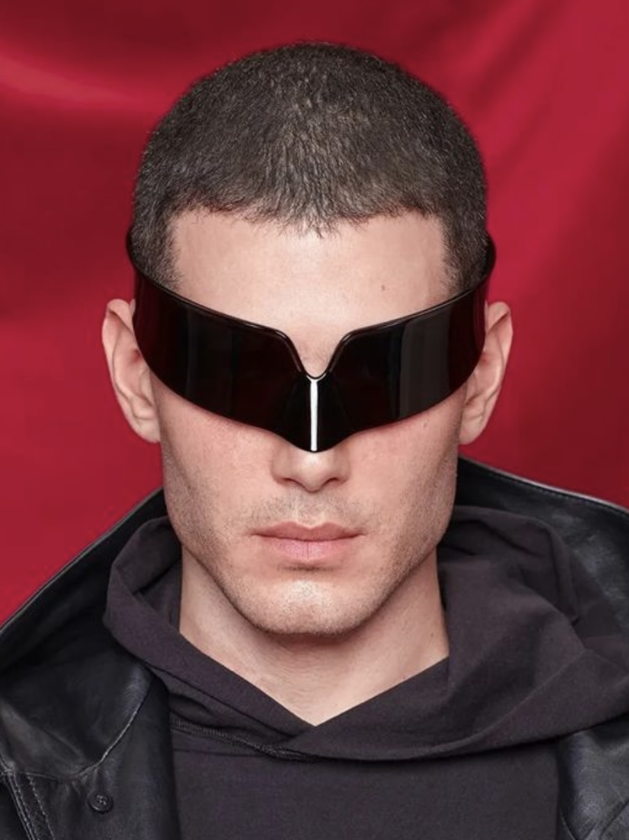 该副墨镜采用 270 度左右的环绕式包裹设计,通体由生物基注射尼龙的镜片打造,无多余配件。