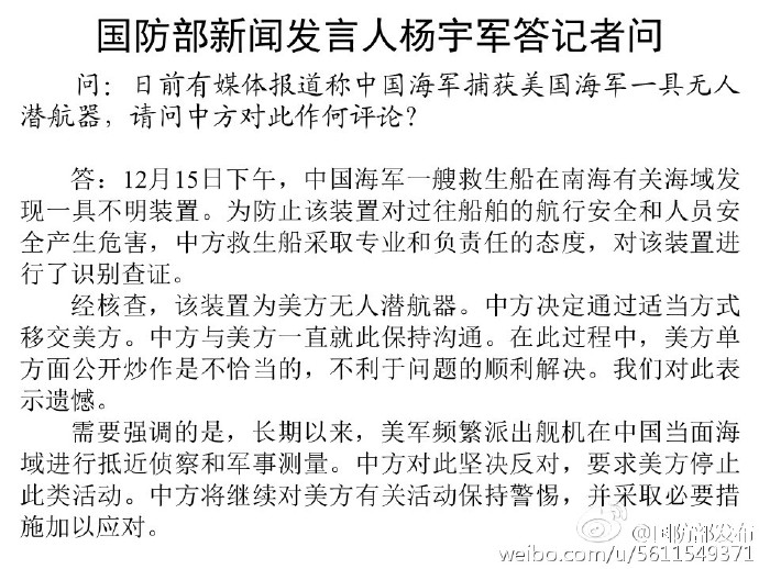 国防部新闻发言人杨宇军答记者问:日前有媒体报道称中国海军捕获美国海军一具无人潜航器,请问中方对此作何评论?