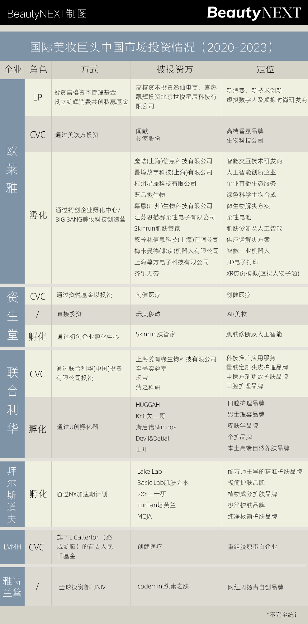 根据BeautyNEXT整理,近几年,国际巨头们在中国通过“VC、初创企业孵化中心,中国投资公司(基金)”三种方式进行投资: