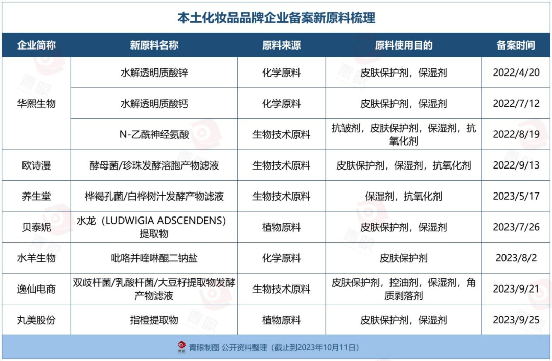 而伴随企业研发实力的提升,消费者对中国成分概念认知逐渐加强,这份名单越来越长,品牌在科研投入的深度与成分应用的广度上也较之前有所精进。典型如,在化妆品新原料的申报上,本土化妆品品牌企业纷纷崭露头角,仅今年,已有贝泰妮、水羊股份、丸美、逸仙电商、养生堂等多家品牌企业完成新原料备案。