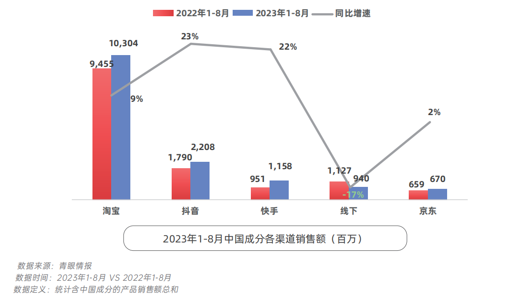 当前,中国成分化妆品的主力渠道在线上,并以淘系为主,1-8月销售额过百亿。增长较快的则是抖音与快手,1-8月同比增长均超过20%。