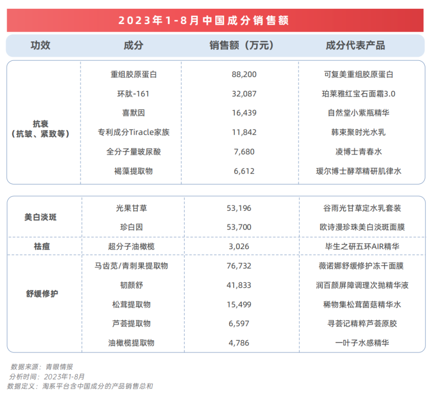 青眼情报从淘系1-8月销量Top500的护肤品中筛选出了中国成分产品,其中,重组胶原蛋白产品销售总额超过8.8亿元,马齿苋/青刺果提取物、光果甘草与珍白因的销售额也均超过5亿,以上4个成分所对应的功效分别为抗衰、舒缓修护和美白。
