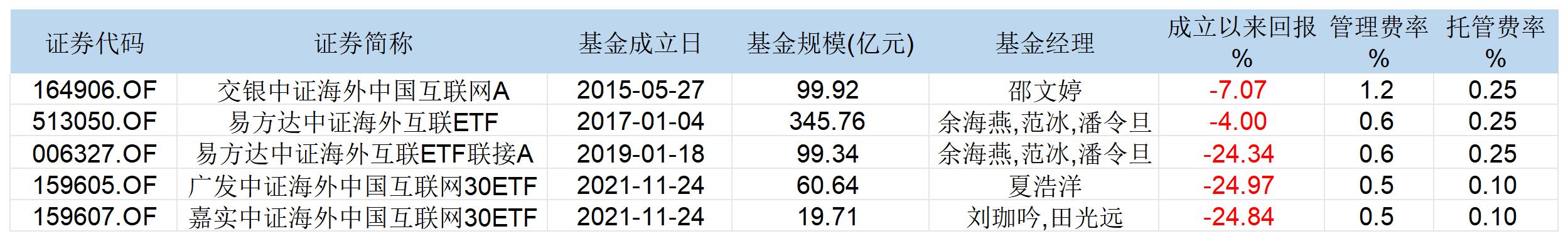 Wind数据显示,截至10月11日,目前市面上共有交银中证海外中国互联网LOF、易方达中证海外互联ETF及联接基金、广发中证海外中国互联网30ETF、嘉实中证海外中国互联网30ETF等4只“中概互联基金”。
