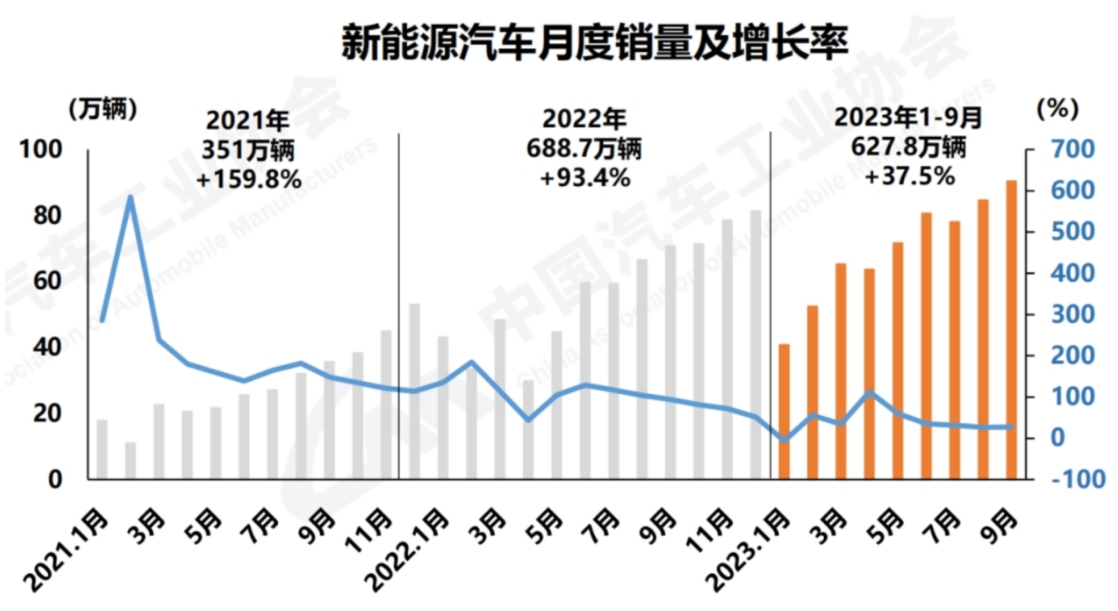 其中,新能源车继续保持较快增长,当月产销分别达到87.9万辆和90.4万辆,环比分别增长4.3%和6.8%,同比分别增长16.1%和27.7%,市场占有率达到31.6%,连续五个月占比超30%。回顾前九个月的数据,我国新能源汽车的产销累计已经达到了631.3万辆和627.8万辆,同比增长了33.7%和37.5%,市场占有率也达到了29.8%。