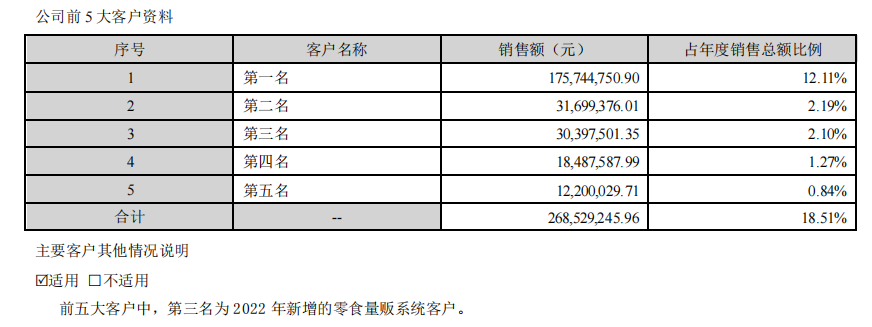 而甘源食品在业绩说明会上也透露,今年上半年,零食折扣渠道已成为业绩新增量的重要来源之一。2022年财报显示,某零食量贩店品牌已经成为甘源食品第三大客户,带来的销售额达3040万元,占2022年全年销售额的2.1%。目前,甘源已入驻零食很忙、赵一鸣零食、零食有鸣、老婆大人、戴永红、来优品等零食量贩店。