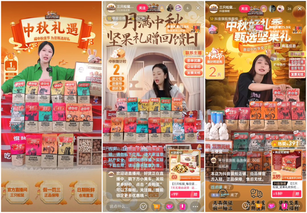 比如中秋节前夕,三只松鼠和洽洽食品等零食品牌的抖音官方直播间背景都已调整为中秋节相关,所售产品也迎合节日氛围。以9月27日下午的直播为例,三只松鼠直播间上架的产品多为礼盒产品,洽洽食品直播间则主打零食大礼包和节日礼盒。