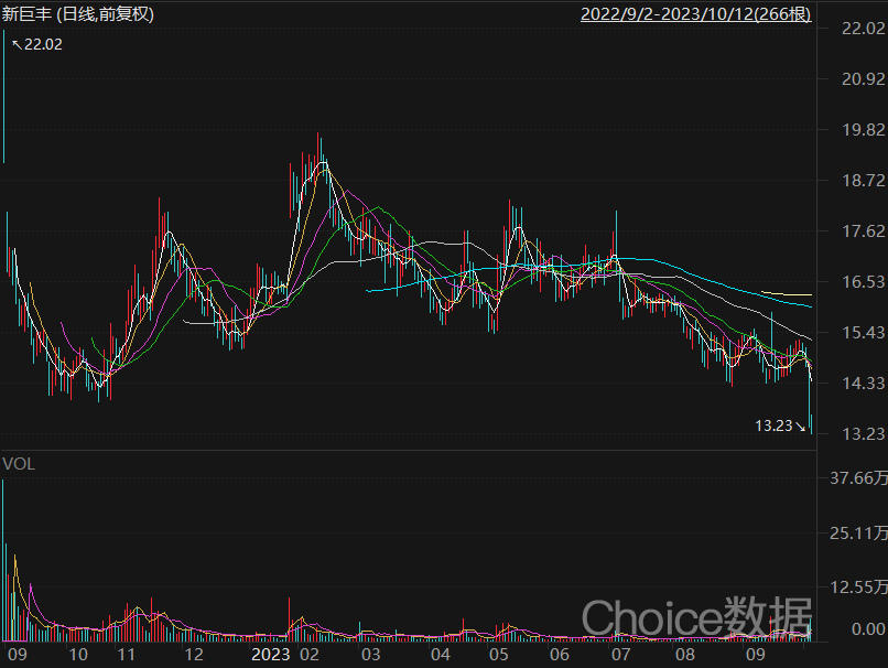 界面新闻注意到,以新巨丰10月10日的收盘价14.70元计算,此次解禁的市值高达30.72亿元。在此背景下,10月11日新巨丰股价大跌6.80%,10月12日盘中刷出13.23元/股的新低,自上市以来长期处于18.19元/股的发行价之下。