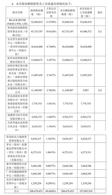 具体从此次解禁涉及的14户股东来看,其中包括新巨丰第二大股东BLACK RIVER FOOD 2 PTE. LTD(下称“BRF”)、第三大股东青岛海丝创新股权投资基金企业(有限合伙)、第四大股东北京厚生投资管理中心(有限合伙)-苏州厚齐股权投资中心(有限合伙)等。