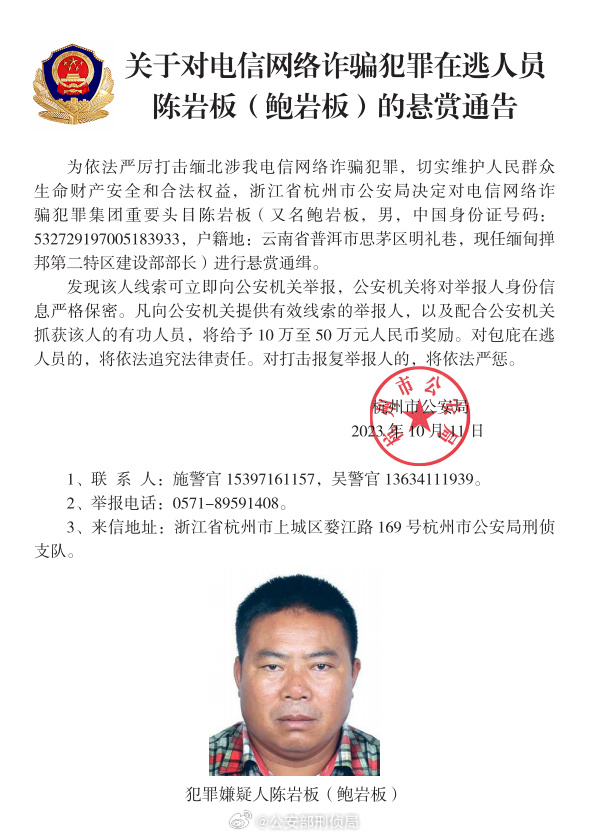 公安部介绍,当前,缅北涉我电信网络诈骗犯罪形势严峻,社会危害严重,人民群众反映强烈。经浙江省杭州市公安局、云南省昆明市公安局侦查发现,陈岩板(又名鲍岩板)、肖岩块(又名何春田)系缅北涉我电信网络诈骗犯罪集团重要头目,长期组织开设诈骗窝点,实施针对中国公民的电信网络诈骗犯罪活动,诈骗数额巨大、性质极其恶劣。