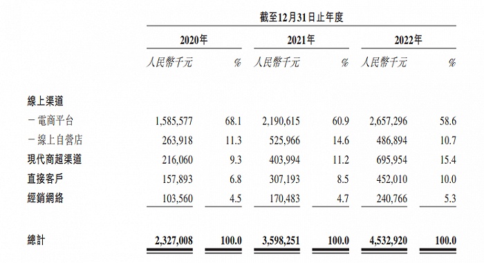 根据招股书显示,2020年至2022年,十月稻田的收入由23.27亿元增长至45.33亿元,年复合增长率达39.6%,其中,线上渠道营收占比超过七成。