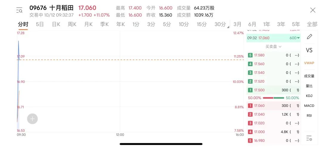 今日,十月稻田正式登陆港交所,发行价15.36港元/股,开盘报16.6港元/股。截至发稿时间,涨11.07%,报17.06港元/股,市值达180亿港元。