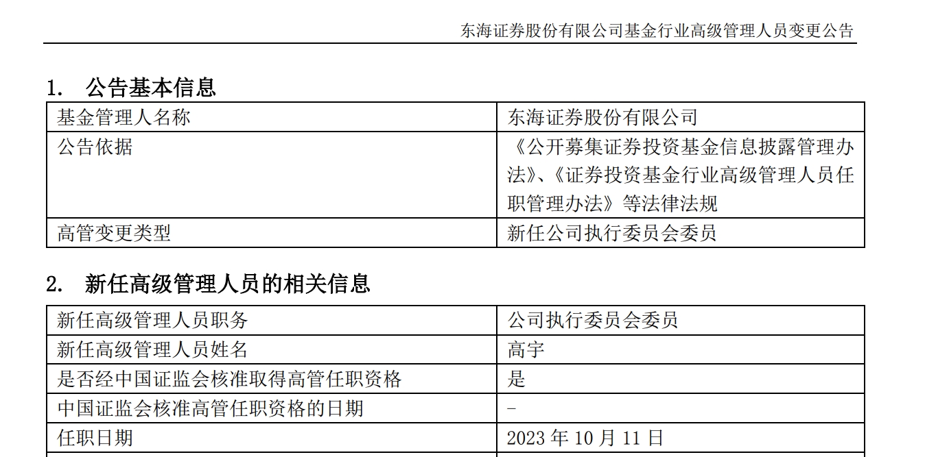 10月11日,东海证券(832970.NQ)发布高管任命公告,经公司董事会议审议通过,聘任高宇为公司执行委员会委员,任期自2023年10月11日开始。