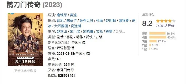 8月,古装东北武侠喜剧《鹊刀门传奇》登陆腾讯视频板凳单元,播出后豆瓣评分从7.8上涨到8.2分,不少观众直呼“成功续命情景喜剧”。灯塔数据显示,该剧全网正片播放市占率及腾讯视频热度值多次获得日冠。