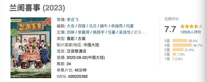 刚刚过去的国庆假期,腾讯视频又一部喜剧《兰闺喜事》成为“黑马”,播出至今关注度持续不减,全网热度连续多日占据骨朵、猫眼专业版剧集榜单TOP3,日前豆瓣也开出了7.7分。