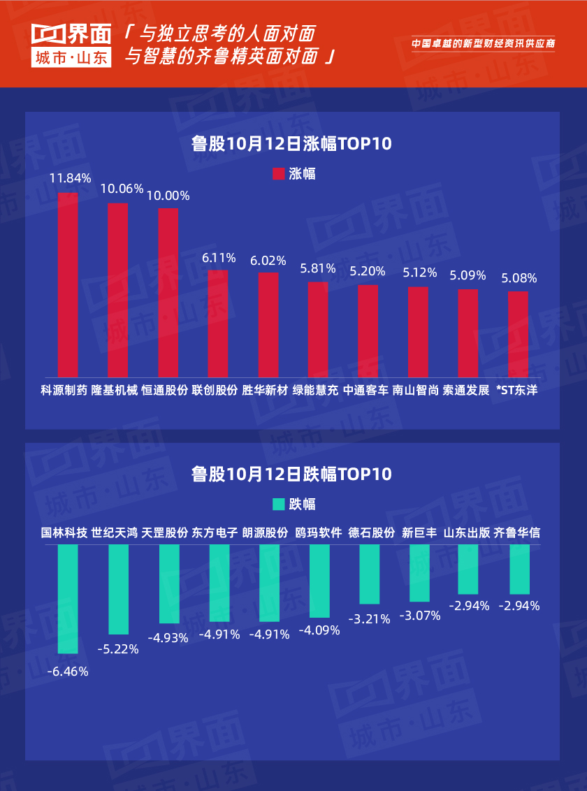 10月12日,山东省内沪深股票有220只个股上涨,76只个股下跌;总市值过千亿的有万华化学(600309)、海尔智家(600690)、兖州煤业(600188)、青岛啤酒(600600)、中航沈飞(600760)、山东黄金(600547)、潍柴动力(000338)共7家,500亿-1000亿的共有5家,分别是中际旭创(300308)、华鲁恒升(600426)、歌尔股份(002241)、浪潮信息(000977)、华电国际(600027)。
