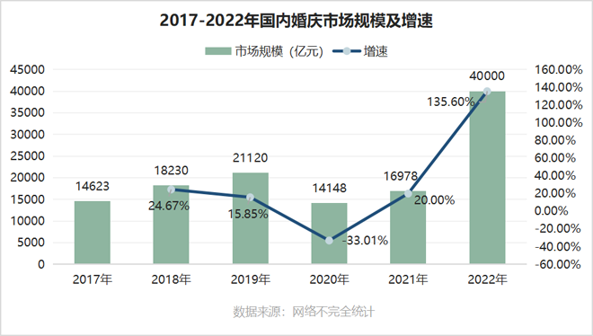数据显示,2017年-2019年我国婚庆产业规模由14623亿元增长至21120.3亿元。2020年受疫情影响,我国婚庆产业规模有所下降,约为14148亿元。2022年国内婚庆行业市场规模突破4万亿元。