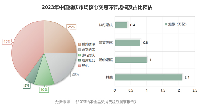 预计今年的婚宴策划市场规模预计将超过2万亿元,占比约50%;婚纱婚服市场规模预计将达到1万亿元,占比约25%;婚宴酒席市场规模预计将达到0.8万亿元,占比约20%;旅行婚庆市场规模预计将达到0.4万亿元,占比约10%;婚庆礼品市场规模预计将达到0.2万亿元,占比约5%。