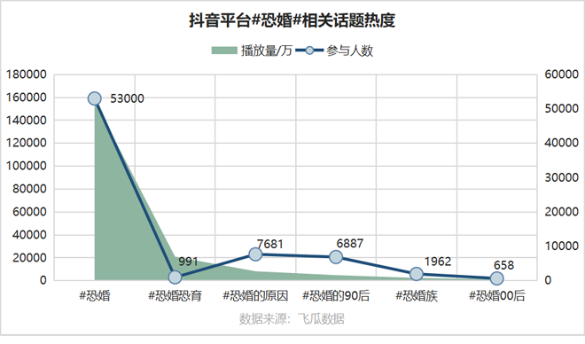 近年,社媒上随处可见恐婚的年轻人。抖音平台上,带上恐婚相关话题的视频热度极高,话题视频播放量最高达到15.7亿次,参与人数超5.3万人;相关话题总参与人数超10万。这还远远只是社交媒体上年轻人恐婚倾向的一个缩影。