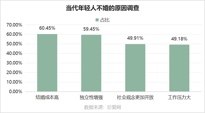 一项关于“当代年轻人不婚原因”的调查数据显示,60.45%的年轻人不婚是由于结婚成本高,59.45%人群不婚的理由是独立性强。随着社会观念的改变,婚姻不再是人生的必选项。面对繁重的生存压力,年轻人的不婚理由中有关社会层面的顾虑若无法得到解决,未来的婚庆市场必然要面临危机。