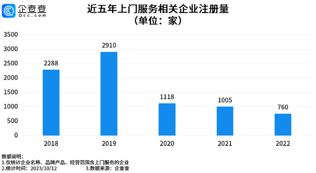 近两年,我国上门服务相关企业数量增长也很快。企查查数据显示,我国现存上门服务相关企业超1.4万家,涵盖了外卖、家政、洗衣、美甲、按摩、维修、生鲜等各个领域。2018-2022年,我国分别新增上门服务相关企业2288家、2910家、1118家、1005家、760家。2023年至今(2023.1.1-10.12),我国新增上门服务相关企业255家。(注:仅统计企业名称、产品名称、经营范围含上门服务的企业)