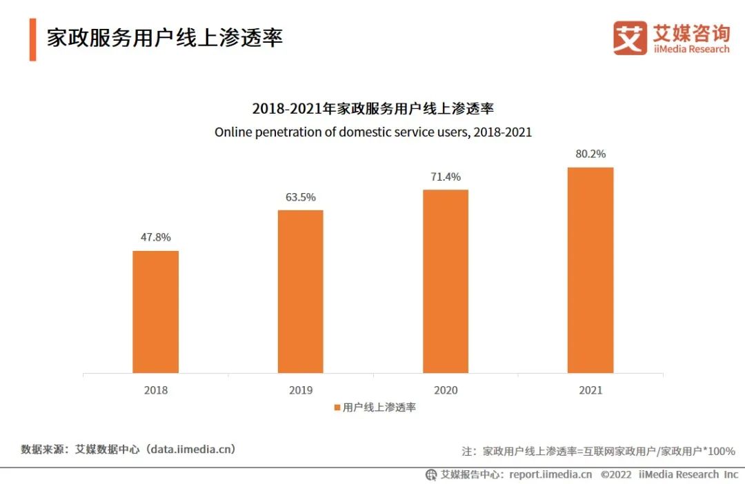 艾瑞咨询调研数据显示,2022年有93.8%的中国消费者使用到家政服务,2018年至2021年间,家政策服务用户的线上渗透率从47.8%上升到80.2%,且家政服务消费预计线上化趋势明显增强。也因此,盯上这一赛道的大平台越来越多。
